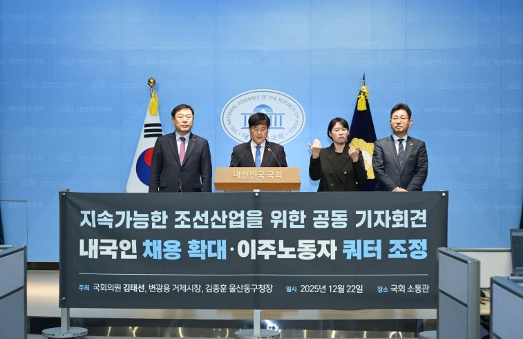 ㈜한국탑뉴스 차복원 기자 | 변광용 거제시장은 지난 22일 김태선 국회의원(울산동구, 환경노동위), 김종훈 울산 동구청장과 함께 국회 소통관에서 기자회견을 열고, ‘조선산업기본법’ 제정, 내국인 채용 확대, 외국인 쿼터 축소를 골자로 한 고용구조 전환의 필요성을 정부에 촉구했다.