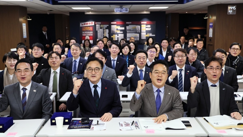 ▲23일(화) 오후 더불어민주당 당사에서 열린 '2025년도 을지로위원회 민생실천성과 보고대회' 참석자들이 기념촬영을 하고 있다.(사진=국회사무처 사진팀)