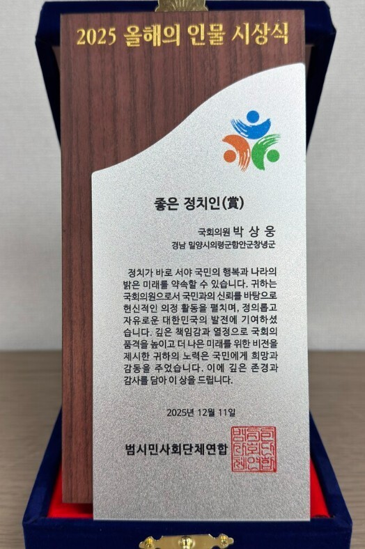 주요 수상 요인으로는 ▲국정 전반에 대한 날카로운 견제와 실질적 대안 마련 ▲민생 경제와 산업 현안을 관통하는 정책 행보 ▲지역구(밀양·의령·함안·창녕)와 국가 전체를 아우르는 균형 잡힌 시각 등이 꼽혔다. 박 의원은 초선임에도 불구하고 원내부대표로서 중앙 정치무대에서 목소리를 내는 동시에, 지역구의 숙원 사업 해결을 위해 발로 뛰는 ‘현장파’ 정치인으로 자리매김했다는 평이다.