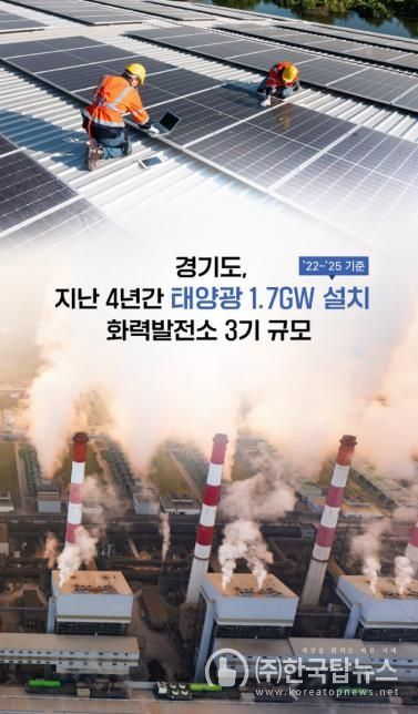 ㈜한국탑뉴스 송행임 기자 | 경기도는 민선 8기(2022~2025년) 동안 총 1.7GW 규모의 태양광발전소가 도에 신규 설치됐다고 2일 밝혔다. 1.7GW는 통상 1기당 500MW 규모인 화력발전소 3기를 상회하는 설비 규모이다. 특히 2025년 한 해만 약 600MW*의 신규 태양광 발전 설비가 보급됐는데, 이는 민선 8기 전체 설치량의 약 3분의 1이 넘는 수준이다. (* 상업용 480MW, 자가용 설비는 과거 데이터로 추정)