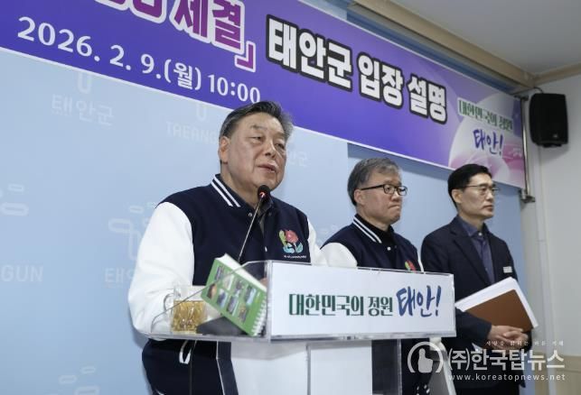 ㈜한국탑뉴스 송행임 기자 | 가세로 태안군수가 9일 군청 브리핑실에서 기자회견을 열고, 국방미래항공연구센터 건립 사업과 관련해 군민의 삶과 안전을 담보하지 않는 일방적인 추진에 대해 강한 우려를 표명했다.