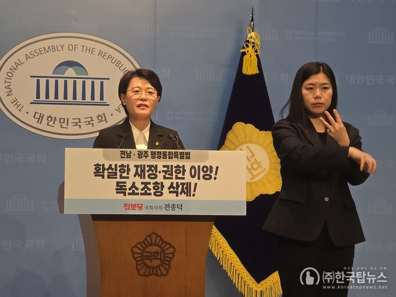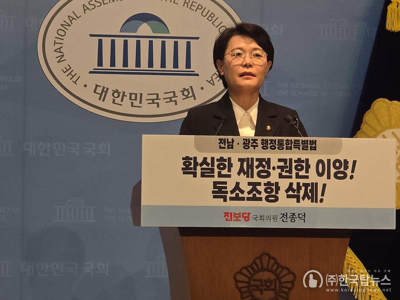 진보당 전종덕 의원은 24일 국회 소통관에서 기자회견을 열고, 현재 추진 중인 '전남·광주 행정통합특별법'이 국가 책임과 실질적 지원이 결여된 채 속도전에만 치우쳐 있다고 비판했다. 전 의원은 행정통합이 지역의 미래를 결정하는 중대한 사안인 만큼, 외형적 틀을 맞추는 것보다 '제대로 된 법 제정'이 선행되어야 한다고 강조했다.