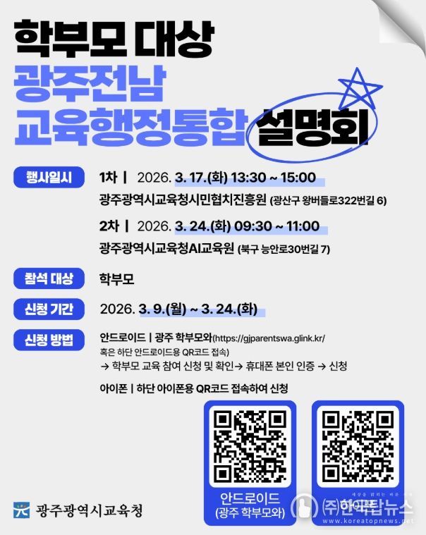 ㈜한국탑뉴스 고화랑 기자 | 광주시교육청이 학부모의 교육행정통합 궁금증을 해소하기 위해 두 차례에 걸쳐 ‘광주·전남 교육행정통합 설명회’를 개최한다.