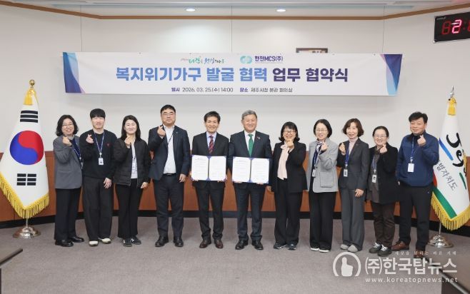 ㈜한국탑뉴스 차복원 기자 | 제주시는 3월 25일 시청 본관 회의실에서 한전MCS 제주지사(지사장 황성태)와 ‘복지위기가구 발굴 협력’ 업무 협약을 체결했다.