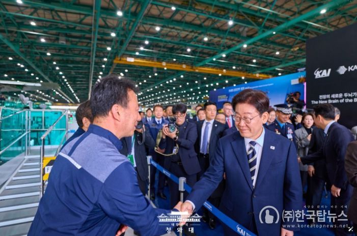 ㈜한국탑뉴스 차복원 기자 | 이재명 대통령은 25일 오후 한국항공우주산업(KAI)에서 열린 KF-21 양산 1호기 출고식에 이어 고정익 생산 현장을 시찰했다.