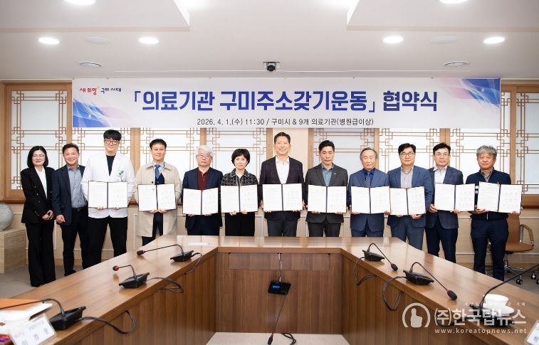 ㈜한국탑뉴스 송행임 기자 | 구미시가 병원급 이상 의료기관 9곳과 손잡고 「구미愛 주소갖기 운동」을 본격 추진하기로 했다. 전체 직원의 80~90%를 구미시 주소로 전환하겠다는 목표를 세우고, 인구 41만 회복을 위한 실질적 동행에 나섰다.