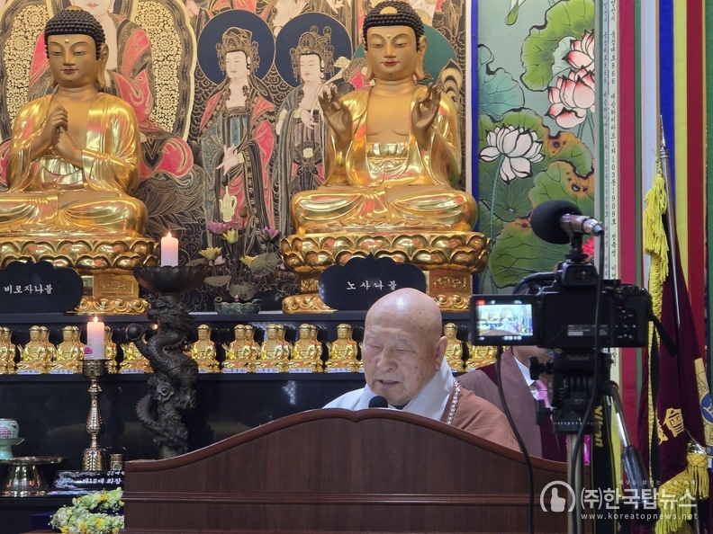 ▲월인 대종사께서 제1세대 대승주로 추대된 화산 월인 대종사께서 법어를 설하고 있다.(사진출처=불탑뉴스)