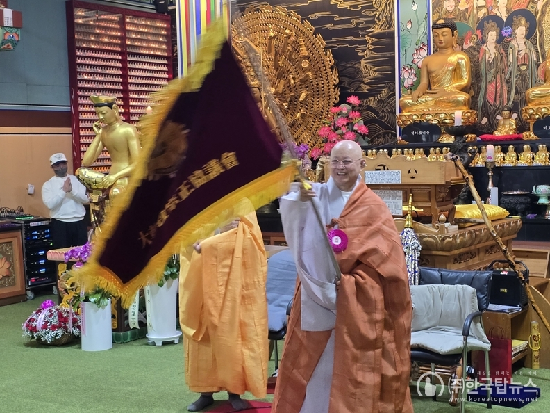 ▲회장에 취임하신 청봉대종사께서 대승주 깃발을 인수 받아 사부대중께 알리고 있다(사진출처=불탑뉴스)