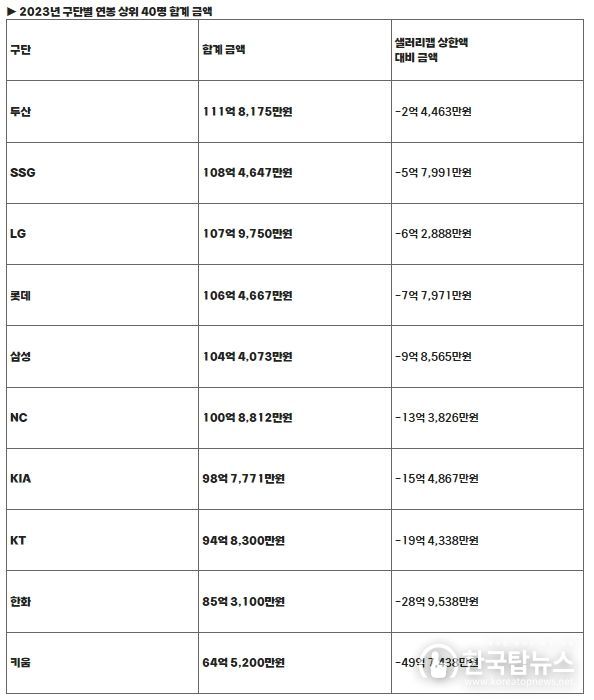 한국탑뉴스 유용식 기자 | KBO(총재 허구연)는 20일(수) 2023년 구단별 연봉 상위 40명의 합계 금액을 발표했다.