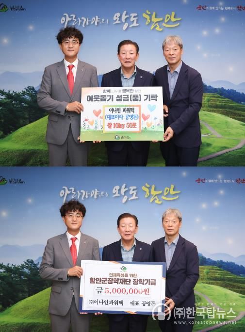 ㈜한국탑뉴스 송행임 기자 | ㈜이나인파워텍은 26일 함안군장학재단에 지역인재 육성을 위한 장학기금 500만 원과 함안군 어려운 이웃을 돕기 위한 쌀(10kg) 50포(120만 원 상당)를 함안군에 기탁했다.