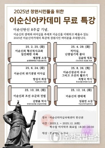 ㈜한국탑뉴스 송행임 기자 | 이순신리더십 국제센터(센터장 송기남)가 창원시민 대상 이순신 장군의 생애와 업적, 뛰어난 리더십 등을 쉽게 이해하고 배울 수 있는 ‘2025 이순신 아카데미 특강’을 개최한다.