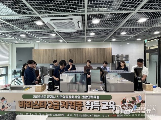 ㈜한국탑뉴스 송행임 기자 | 문경시 농촌활성화지원센터는 지난 26일부터 한 달 동안 문경시 주민을 대상으로 적극적인 전문인력 양성을 위하여 바리스타 2급 자격증 취득 교육을 진행중이다. 이번 교육은 문경시 신활력 플러스 사업의 일환으로 건립한 영순면 문경이음센터에서 진행된다.