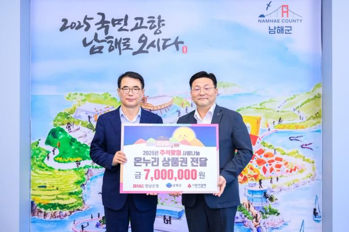 ㈜한국탑뉴스 차복원 기자 | 남해군은 지난 30일 BNK경남은행 남해지점이 추석 명절을 앞두고 700만원 상당의 온누리상품권을 기탁했다고 밝혔다.