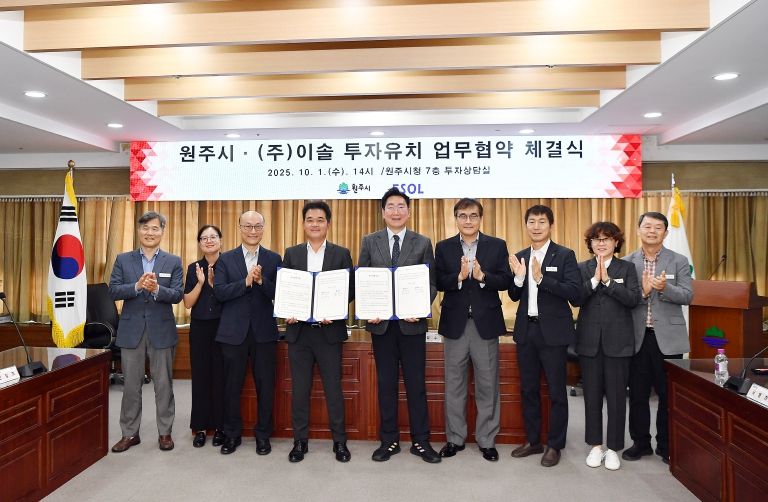 ㈜한국탑뉴스 차복원 기자 | 원주시는 10월 1일 오후 2시, 시청 7층 투자상담실에서 ㈜이솔(대표 김병국)과 투자유치 협약(MOU)을 체결했다. 이번 협약은 총 505억 원 규모의 투자로, 부론일반산업단지에 소형 방사광가속기와 첨단 EUV 반도체 검사장비 연구·생산시설을 구축하는 사업이다. EUV(Extreme Ultra-Violet)는 반도체 초미세 공정(7nm 이하)에 필수적인 광원이다.