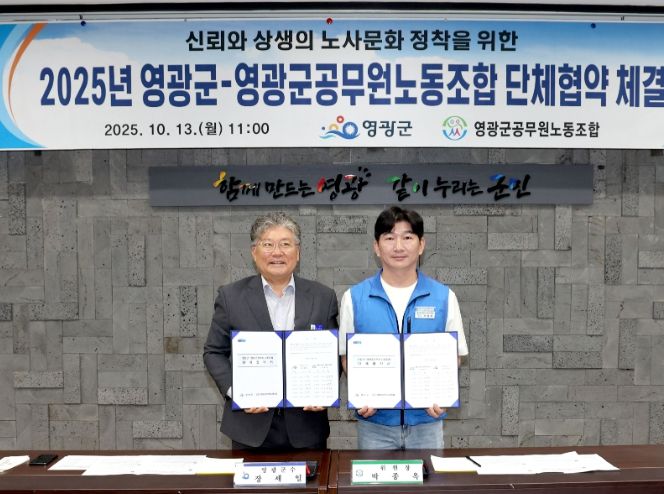 ㈜한국탑뉴스 차복원 기자 | 영광군은 지난 10월 13일 군청 2층 소회의실에서 영광군공무원노동조합과 “2025년 단체협약식”을 체결했다.