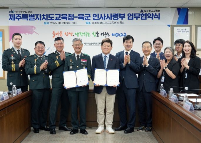 ㈜한국탑뉴스 고화랑 기자 | 제주특별자치도교육청은 13일 도교육청 상황실에서 육군 인사사령부와 고등학생들의 진로 탐색 기회 확대를 위한 업무협약을 체결했다.