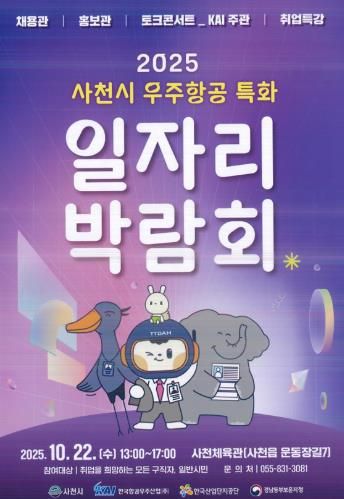㈜한국탑뉴스 차복원 기자 | 사천시는 오는 10월 22일 사천체육관에서 항공산업 중심의 청년 고용기회 확대를 위해 ‘2025년 사천시 우주항공특화 일자리박람회’를 개최한다.