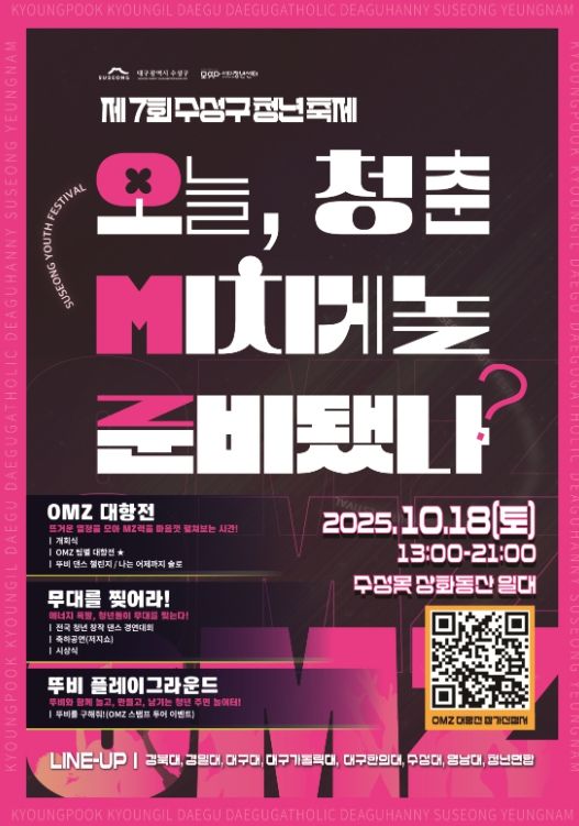㈜한국탑뉴스 차복원 기자 | 대구 수성구는 오는 18일 수성못 상화동산 일대에서 ‘2025 제7회 수성구 청년축제’를 개최한다.