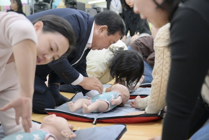 ㈜한국탑뉴스 차복원 기자 | 최민호 세종특별자치시장이 21일 종촌동 육아종합지원센터에서 ‘찾아가는 현장소통’을 열고 영유아 학부모 40여 명과 함께 심폐소생술을 재숙지하고 응급대처의 중요성을 공유했다.