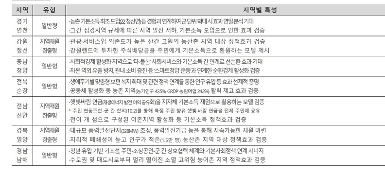 특히 이번 시범사업은 다양한 농어촌 여건에 맞는 유형별 효과를 검증한다는 측면을 고려하여 조례제정 여부, 유사 정책 시행 경험 등 도입 의지와 정책적 역량 등 시범사업 종료 이후 지속가능성에 주안점을 두었다.