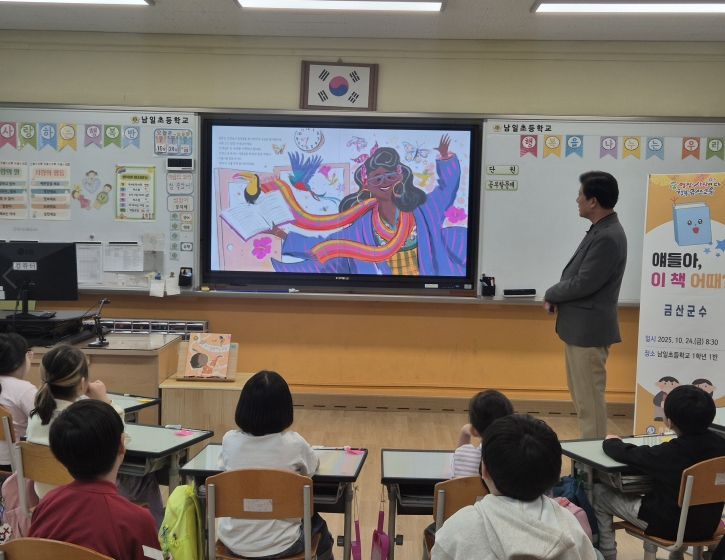 ㈜한국탑뉴스 차복원 기자 | 박범인 금산군수는 지난 24일 남일초를 방문해 학생들과 함께 그림책 읽는 시간을 가졌다.