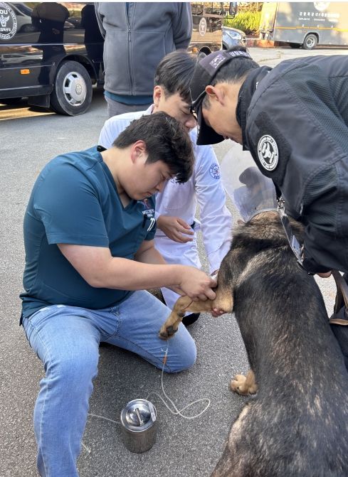 새로운 환경과 임무 수행 중 건강에 문제가 있는 경찰견을 대상으로 현장에서 의료 지원을 했다.”라고 말했다.