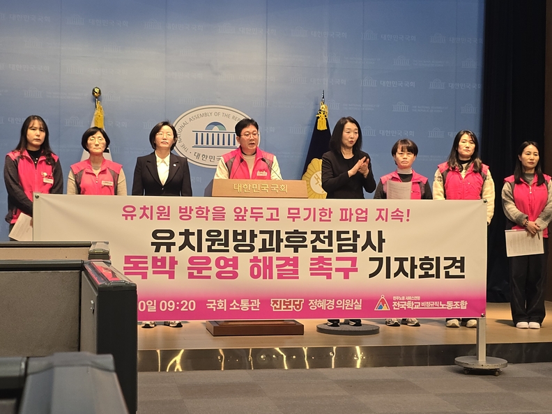 전국학교비정규직노동조합(위원장 민태호, 이하 학교비정규노조)은 30일 국회 소통관에서 기자회견을 열고 진보당 정혜경의원과 국·공립 유치원 방과후 전담사들이 처한 차별적 처우와 열악한 노동환경 개선을 강력히 촉구했다.