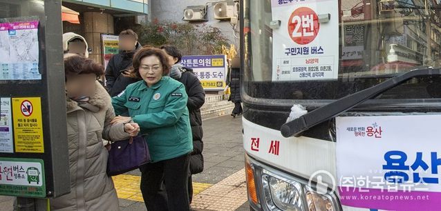 ㈜한국탑뉴스 송행임 기자 | 박희영 서울 용산구청장이 서울시내버스 파업으로 출퇴근길 교통 혼잡이 우려되는 가운데, 13일 오전 무료 셔틀버스 운행 현장을 직접 찾아 출근길 주민 불편 사항을 점검했다.