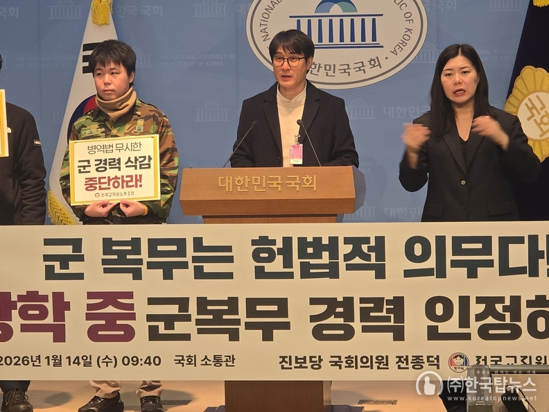 ▲진보당 전종덕 의원, 교육부의 ‘군 경력 삭감’ 규탄 및 원상회복 촉구(사진출처=한국탑뉴스)