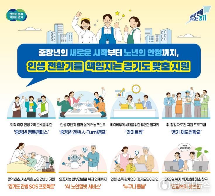 ㈜한국탑뉴스 송행임 기자 | 퇴직 이후의 삶을 어떻게 꾸려야 할지 고민하는 중장년부터, 간병과 돌봄 문제로 어려움을 겪는 어르신과 가족까지. 경기도는 올해도 도민이 인생의 전환기에서 새로운 기회를 얻고 안정적으로 생활할 수 있도록 맞춤형 정책을 계속해 나간다.