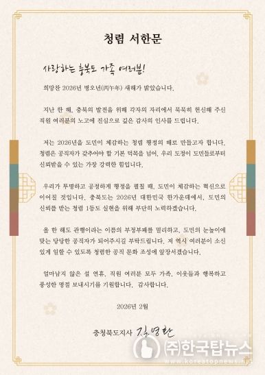 ㈜한국탑뉴스 송행임 기자 | 김영환 충북도지사가 2026년 병오년(丙午年)을 ‘도민이 체감하는 청렴 행정의 해’로 만들겠다는 의지를 담은 청렴서한문을 전 직원에게 발송하고, 올 한 해 청렴 실천을 당부했다.