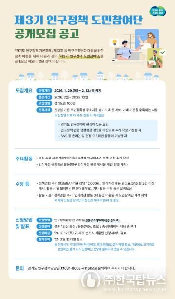 ㈜한국탑뉴스 송행임 기자 | 경기도가 정책 대상자가 직접 정책개선에 참여하는 ‘제3기 인구정책 도민참여단’ 100명을 공개 모집한다.
