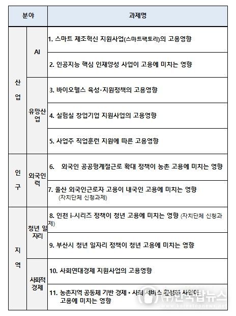 이날 회의에서는 2026년도 평가대상 후보과제에 대해서도 심의가 이뤄졌는데, 그간 고용 및 산업 전문가, 관계부처, 자치단체 등의 의견수렴 등을 거쳐 11개 후보과제가 발굴되었고, AI 등 유망산업분야(5개), 외국인 고용 등 인구구조분야(2개), 청년일자리・사회적 경제 등 지역정책분야(4개) 등 일자리에 영향을 미치는 주요 정책과제들로 확정되었다.