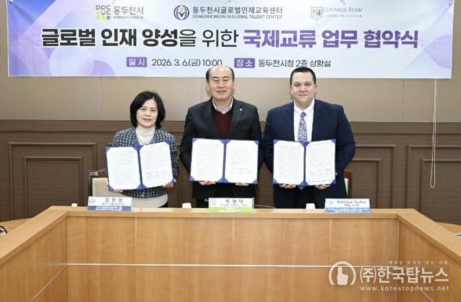 동두천시는 지난 6일 오전 10시 동두천시청 상황실에서 박형덕 동두천시장, 김한경 동두천시글로벌인재교육센터(㈜한원글로벌) 대표, 매튜 피셔(Matthew Fischer) 콘웰이건 가톨릭고 이사장 등 주요 관계자들이 참석한 가운데 ‘청소년 국제교류 활성화 및 글로벌 교육 협력체계 구축을 위한 업무협약(MOU)’을 체결했다고 밝혔다.