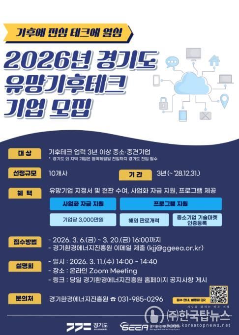 ㈜한국탑뉴스 송행임 기자 | 경기도와 경기환경에너지진흥원이 기후위기 대응을 선도할 혁신 기술 보유 기업을 발굴하기 위해 오는 3월 20일까지 ‘2026년 경기도 유망 기후테크 기업’ 10곳을 모집한다.