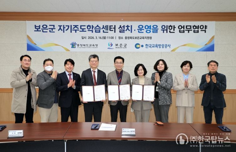 ㈜한국탑뉴스 송행임 기자 | 충북 보은군은 16일 보은교육지원청에서 충청북도교육청, 한국교육방송공사(EBS)와 보은군 자기주도학습센터 설치·운영을 위한 업무협약을 체결했다.