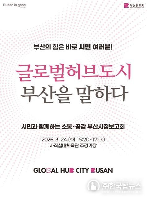 ㈜한국탑뉴스 송행임 기자 | 부산시는 오는 24일 오후 3시 20분 사직실내체육관 주경기장에서 시민과 지역 주요 인사 등이 참석한 가운데 '글로벌허브도시 부산을 말하다' 시정보고회를 개최한다고 밝혔다.