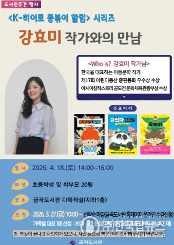 ㈜한국탑뉴스 송행임 기자 | 부산 북구는 제62회 도서관주간을 맞아 4월 18일 오후 2시, 금곡도서관에서 인기 동화 'K-히어로 똥볶이 할멈'의 저자 강효미 작가를 초청해 ‘작가와의 만남’을 개최한다고 밝혔다.