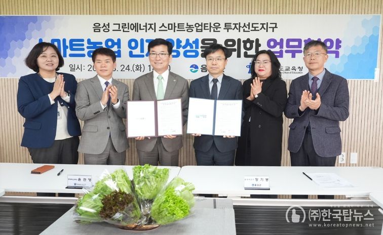 ㈜한국탑뉴스 송행임 기자 | 음성군은 24일 H&A 스마트팜과 그린에너지 스마트농업타운 대상지 일원에서 충청북도교육청과 함께 지역 교육발전 방향과 미래 인재 양성 협력방안을 모색하기 위한 정책간담회를 열고 공동협약을 체결했다.