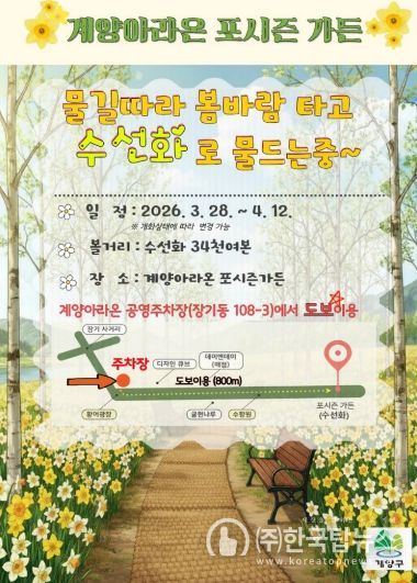 ㈜한국탑뉴스 송행임 기자 | 인천광역시 계양구는 봄을 맞아 계양아라온 일대에 대규모 꽃 식재를 완료하고, 포시즌가든을 중심으로 수선화가 개화하기 시작하며 화사한 봄 경관을 선보이고 있다고 밝혔다.