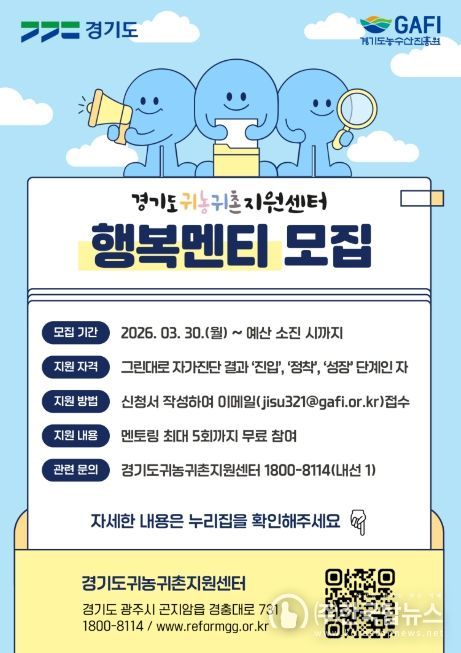 ㈜한국탑뉴스 송행임 기자 | 경기도와 경기도농수산진흥원이 운영하는 경기도귀농귀촌지원센터는 경기도로 귀농·귀촌을 희망하는 도시민과 초기 정착 단계의 귀농귀촌인을 대상으로 ‘2026년 귀농귀촌 행복멘토링 행복멘티’를 상시 모집한다.