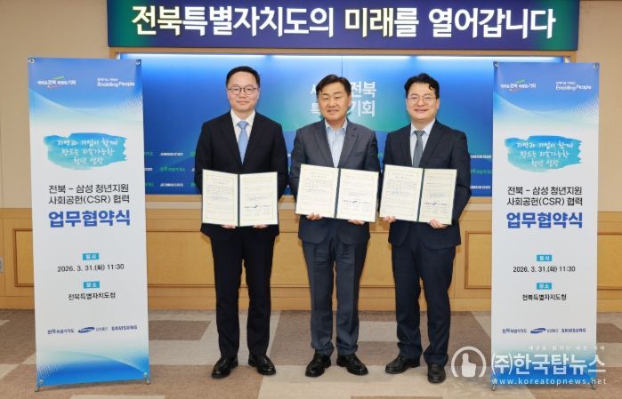 ㈜한국탑뉴스 송행임 기자 | 전북특별자치도가 삼성물산·삼성전자와 손잡고 전북 청년 지원을 위한 사회공헌 파트너십을 본격 가동한다.