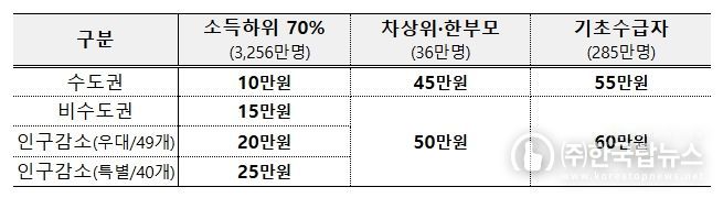 소득 하위 70% 국민에게 거주 지역별로 수도권 10만원, 비수도권 15만원, 인구감소 우대지역 20만원, 인구감소 특별지역 25만원을 지급할 예정이며, 한부모가족・차상위계층은 45만원, 기초생활수급자는 55만원을 지급하되 비수도권에 거주하는 경우에는 1인당 5만원을 추가 지급한다.