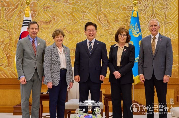 ㈜한국탑뉴스 차복원 기자 | 이재명 대통령은 4월 2일 오후 청와대에서 진 섀힌(Jeanne Shaheen) 상원 외교위원회 간사 등 공화·민주 양당 의원으로 구성된 미국 상원의원 대표단을 접견했다. 이 대통령과 미 대표단은 한미동맹 및 한반도 문제를 비롯해 중동 전쟁의 안보적·경제적 파장과 대응 방안에 대해 심도 있는 의견을 교환하고, 향후 경제적 여파 대응 과정에서 한미가 긴밀히 소통해 나가는 것이 중요하다는 점에 뜻을 같이 했다.