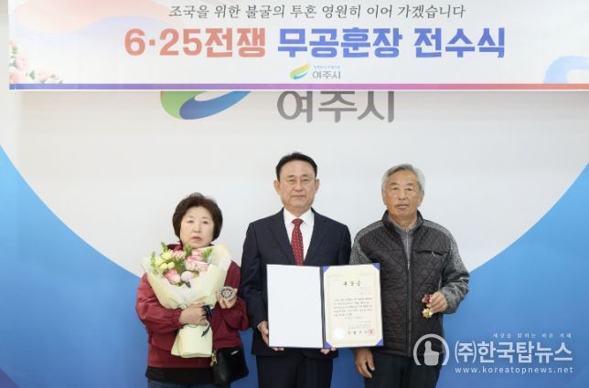 ㈜한국탑뉴스 송행임 기자 | 여주시는 지난 2일 6‧25전쟁 무공훈장 전수식을 개최하고, 故이석만 상사의 공적을 기리며 화랑무공훈장을 유가족에게 전수했다.