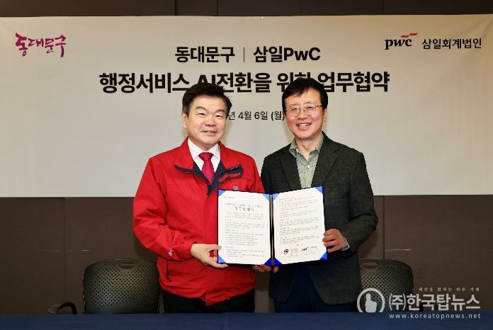 ㈜한국탑뉴스 송행임 기자 | 서울 동대문구는 공공 행정서비스의 인공지능 전환, 이른바 AX(Artificial Intelligence Transformation)를 본격 추진하기 위해 삼일PwC와 업무협약을 맺었다. 구는 6일 서울 용산구 삼일PwC TS홀에서 협약식을 열고, 행정서비스 전반에 AI를 어디에, 어떤 방식으로 적용할지 함께 진단하고 자문받는 협력 체계를 마련했다고 밝혔다. 이번 협약은 새 기술을 들여오는 데 그치지 않고, 행정 효율을 높이면서도 구민이 실제로 체감하는 서비스 변화를 만들어내는 데 초점을 맞췄다. 민간의 전문성을 바탕으로 공공행정에 맞는 AX 모델을 짜보겠다는 뜻이다.