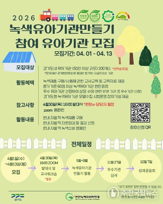 ㈜한국탑뉴스 송행임 기자 | 경기도가 아이들이 생활 속에서 올바른 녹색 소비 습관을 가질 수 있도록 돕는 ‘2026년 녹색유아기관만들기’ 참여 기관 200곳을 4월 13일까지 모집한다.