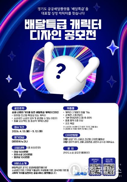 ㈜한국탑뉴스 한민석 기자 | 경기도주식회사가 오는 5월 12일까지 공공배달앱 배달특급의 캐릭터 디자인을 공개 모집한다.