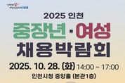 ㈜한국탑뉴스 차복원 기자 | 인천광역시는 중장년과 여성의 새로운 일자리 도전과 사회 참여 확대를 지원하기 위해 오는 10월 28일 인천시청 중앙홀에서 ‘2025 인천 중장년·여성 채용박람회’를 개최한다고 밝혔다. 이번 박람회는 올해 다섯 차례 진행된 ‘2025 인천 상설 채용박람회’의 마지막 일정으로, 인천시와 성평등가족부, 중부지방고용노동청 등 10개 기관이 공동으로 주최한다. 이번 행사에는 33개 기업이 참여해 현장 면접을 진행하고, 구직자들에게 실질적인 취업기회를 제공할 예정이다. 또한 채용관 외에도 ▲이력서 사진 촬영 ▲퍼스널컬러 진단 ▲인공지능(AI) 캐리커처 제작 등 구직자의 이미지 개선과 취업 경쟁력 향상을 위한 다양한 체험프로그램이 함께 운영된다. 연계행사로는 대회의실에서 ‘여성의 취·창업 역량 강화’를 위한 특별강연이 오전·오후로 두 차례 나뉘어 진행된다. 오전 1차 특강에서는 개그맨 출신 사업가 고명환이 강사로 나서 중장년층의 창업 전환을 주제로 실질적인 경험과 노하우를 전달하고, 오후 2차 특강에서는 과학 유튜버‘궤도’가 디지털 리터러시 향상과 인공지능(AI)을 활용