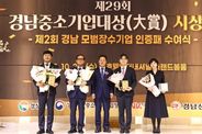 ㈜한국탑뉴스 차복원 기자 | 경상남도는 22일 오후 호텔 인터내셔널 창원에서 ‘제29회 경남중소기업대상 시상식’ 및 ‘제2회 경남 모범장수기업 인증패 수여식’을 개최했다. 이번 행사는 경남지방중소벤처기업청(청장 손한국), BNK경남은행(행장 김태한), 경남신문(회장 이종붕)과 공동으로 열려 지역경제 발전에 기여한 중소기업과 장기 재직자의 노고를 격려했다. 경남도는 이날 시상식에서 “국내외 어려운 경영환경 속에서도 경남이 3년 연속 무역수지 흑자를 기록하고, 역대 최고치의 고용률을 달성한 것은 경남 경제의 주체인 중소기업 덕분”이라며, “기업이 잘 돼야 도민의 행복지수가 높아지는 만큼, 현장의 애로를 청취하고 지원을 이어가겠다”고 밝혔다. ‘경남중소기업대상’은 기술․경영 혁신으로 신제품 개발, 고용․수출 확대, 노사 동반 성장 등 지역경제 발전에 기여한 중소기업과 장기 재직자의 노고를 격려하기 위해 1996년부터 매년 수여해오고 있다. 지난해까지 총 202개 기업과 131명의 장기 재직자가 수상했으며, 올해는 6개 부문 9개 기업과 우수 장기 재직자 10명이 수상의 영예를 안았다. 부문별